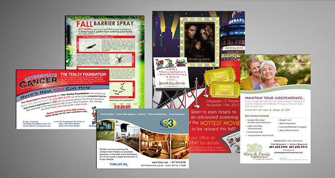 These flyers and product sheets were designed to showcase specific products, services, and events for our clients. The designs were also used in magazines, direct mail marketing, and coupon mailers.