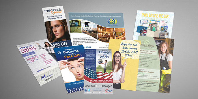These brochures, rack cards, postcards, and magazine ads were designed to promote products and services, sales, and special events. These are designed and printed at different sizes and on different paper types. These designs were used in direct mail and marketing campaigns.
